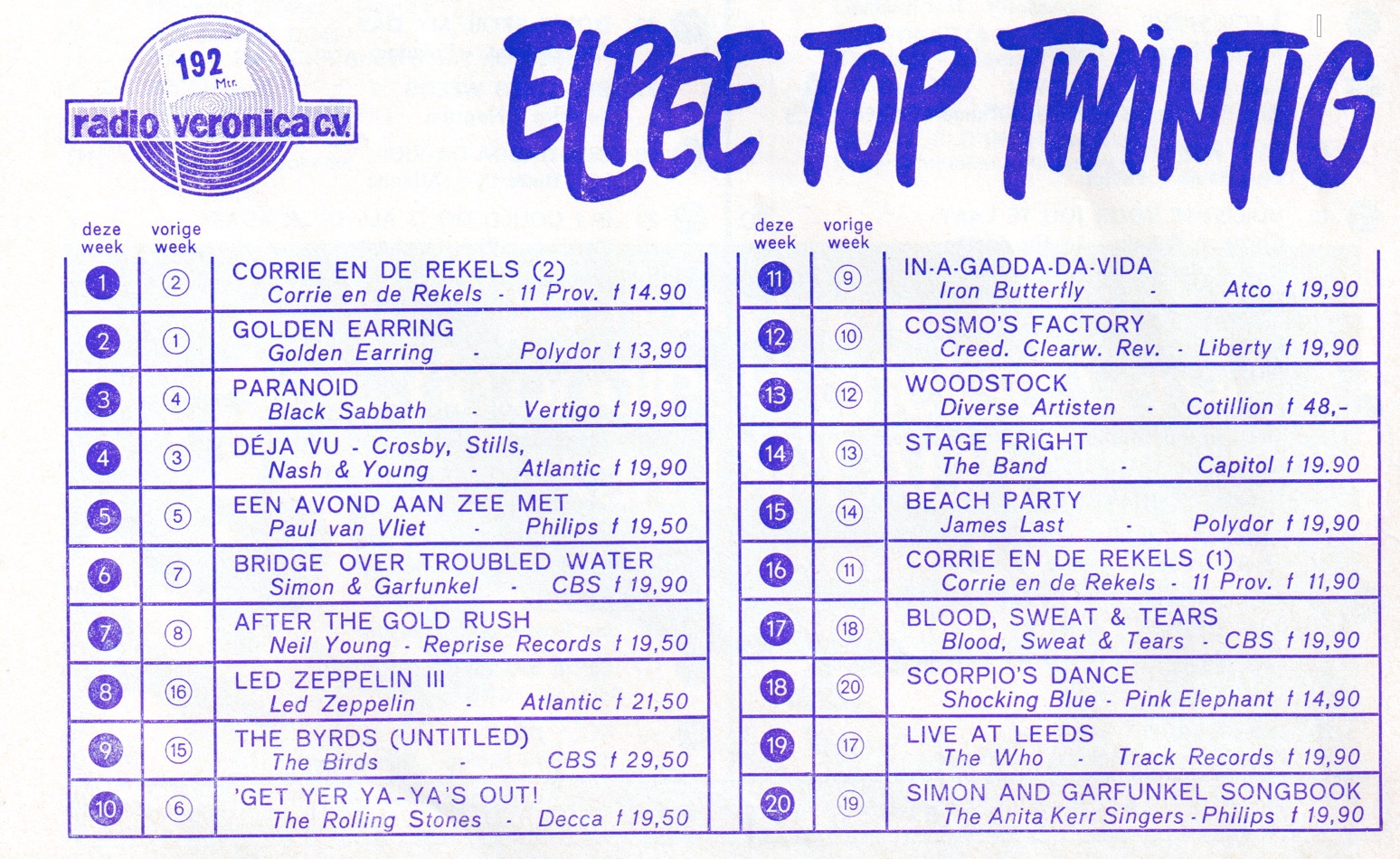 Geplaatst 4 september 20205 jr. 22 uur geleden zei Juul: Nee ik bedoel gewoon de lijstjes zoals ze afgedrukt werden op het front Top 40 blaadje. Tenminste tot eind september 1970. Daarna heb ik nog een scan misschien van de achterkant? van de top 40 ? Deze is van 31 oktober 1970. Maar ik heb wel alle scans van de Top 40. Ook nog een mogelijkheid, het is gewoon gestopt. in dat jaar. Maar verder heb ik geen idee........... Hier heb ik ook niet zoveel aan: https://nl.wikipedia.org/wiki/LP_Top_20 Dank trouwens dat je effe reageert Douwe, er zitten hier veel hitparade freaks maar waarschijnlijk is dit "te oud" voor ze.....hi. Zo he! 48 gulden voor de driedubbel-Lp van Woodstock! Dat was in 1970 volgens mij zowat een weekloon! Of vergis ik me? Ik vind de enkele LP's voor die tijd ook behoorlijk aan de prijs. Edwin