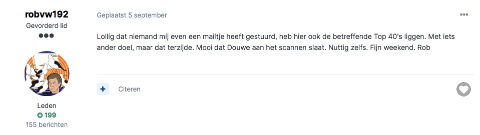 Geplaatst 13 september 20205 jr. Auteur 1 uur geleden zei Armand: Waarom maak je het toch altijd zo persoonlijk Juul ? Dag Armand, Ik moet me toch tot RobvW192 richten ? Dan is dat toch persoonlijk? Ik geef toe m'n antwoord is stevig maar soms moet dat dan maar om zaken duidelijk te krijgen. Kijk ik snap nu de uitleg van RobvW192 die hierboven staat. Had ie dat maar veel eerder gedaan. Hij heeft dus niet alles. Maar z'n eerste posting deed vermoeden dat ie wel alles heeft. Lees hieronder nog maar eens na. Ik ben blij met de snelle aktie van Douwe. Althans ik heb ze doorgestuurd naar Ad Bouman. Hij wilde ze hebben. En da's nu gelukt. Ik doe er niks mee. Mooie dag voor iedereen. Ik ga met m'n computer en de mail an de slag. M'n mail is een beetje in de war....... 22 minuten geleden zei Juul: En voor op deze mooie dag een jingle die ik ooit knipte............ van de master. Zullen we het LP top 20 item nu maar afsluiten? https://pixeldra.in/u/VuDcuYjf 13 september 20205 jr. bewerkt door Juul