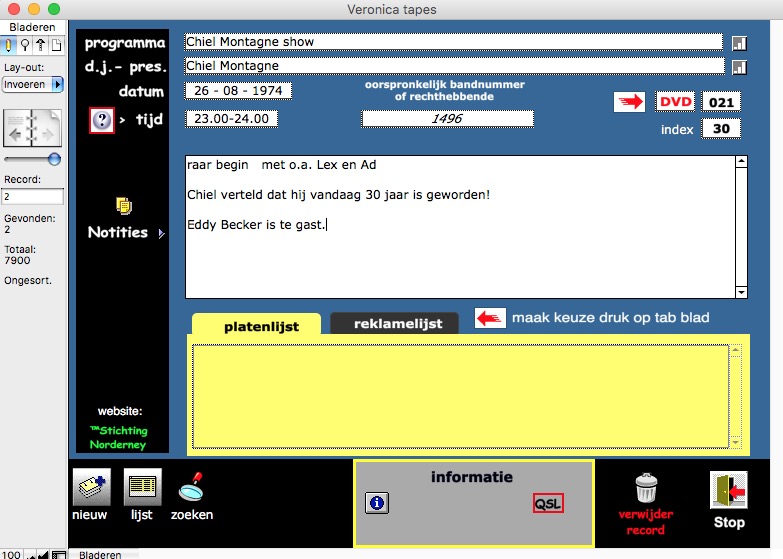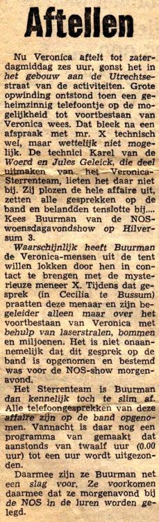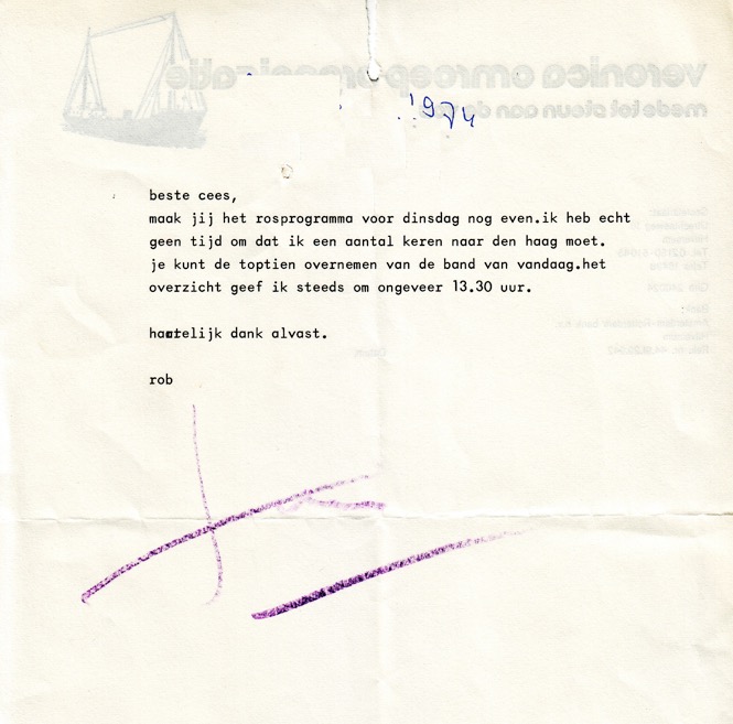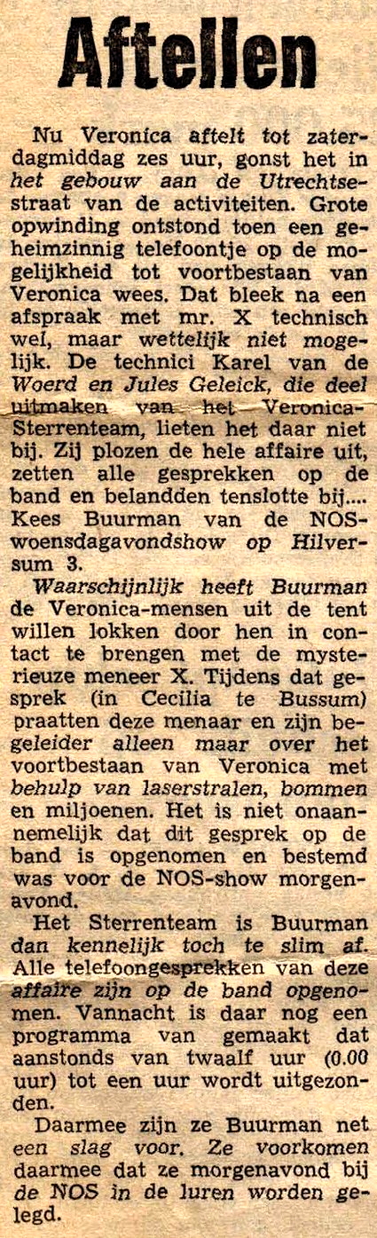 Geplaatst 7 mei 20214 jr. Populair bericht Ik begrijp werkelijk niet hoe de programmanaam in de wereld is gekomen. Hier de werkelijke en correcte info. ©Stichting Norderney. Datum 27 augustus 1974 tijd: 24.00 - 01.00 uur De datum die Will opnoemt is de opname datum!!!!! Kolder op Zolder show - "Drie Sterren Special", Let op: de uitzendband zit ook in het archief!!!! zie DAT: 330-2 Let op: de ruwe banden ( 2H30’ ) zitten ook in het archief!!!! zie DAT: 450-2 Kolder op Zolder show - "Drie Sterren Special",(uitleg naam zie hieronder). 27 augustus 1974. Zit een mal verhaal aan vast: een "journalist van een streekkrant" belt Veronica met de boodschap dat ie de tussenpersoon is van een vent die Veronica wil redden, hij heeft een systeem waarmee Veronica hoogfrequent in plaats van laagfrequent kan uitzenden en dat zou volgens het Verdrag van Straatsburg nog wel mogen! Klinkt vaag en dat blijft ook zo. Rob Out neemt het telefoontje aan, begrijpt het niet allemaal en verbindt door naar hoofdtechnicus (sic) Ad Bouman, "gespeeld" door Juul Geleick. Bij Veronica heeft men gevoel dat ze er worden ingeluisd, vooral omdat de "redder" anoniem wil blijven, zelfs niet wel bellen, maat een equippe van Veronica wel wil ontmoeten. Juul vindt dat in tegenspraak met elkaar. Ze zeggen eerst nee, besluiten daarna toe te happen en alles stiekem op te nemen, zowel de telefoontjes als de ontmoeting - temeer omdat ze denken dat Kees Buurman van "NOS op woensdag" er achter zit. Juul en Karel (van der Woerd) gaan kijken in café-restaurant Ceciel in Bussum en krijgen wild verhaal te horen over "wapenhandelaar" etc. Daarna wordt journalist ontmaskerd in Ceciel in Bussum als Ben Dingerdis van de NOS (inderdaad dus...) en de integrale band werd uitgezonden in de éénnalaatste KOZS, met teksten van Will Luikinga ertussen en hier en daar een plaatje. Daarmee wordt gepoogd vliegen af te vangen van de NOS, die -zo wordt wel duidelijk - de gesprekken ook had opgenomen. Later probeert Hans Wilbrink (voorheen plugger en nu werkzaam bij de VARA en toen buurman van Juul) er via een telefoontje achter te komen hoe de vork in de steel zit,......maar het blijft allemaal vaag! En zal wel nooit opgehelderd worden. Uitleg 3 Sterren: Ad; Juul en Karel waren vaak betrokken als technici bij bijzondere Veronica projecten. Het af-breken en weer opbouwen van en Veronica studio op "vreemde" plaatsen e.d. Iemand noemden hun een keer "3 Sterren". Vandaar de naam. Ook hadden ze een soort visite kaartjes laten maken met opdruk. We horen aan het eind Hans Wilbrink †2020 - van de Nieuwe Revue en buurman van Juul in Bunschoten. =========== tel gesprek Rob Out met Felix Fulpen tel. gesprek juul Geleick met felix fulpen WE CAN WORK IT OUT - BEATLES tel. gesprek juul Geleick met felix fulpen SUMMER IN THE CITY - LOVIN' SPOONFUL (kort) tel. gesprek juul Geleick met karel vd woerd tel. gesprek Karel vd woerd met felix fulpen ALL ALONG THE WATCHTOWER - JIMI HENDRIX ITCHYCOOPARK - SMALL FACES GREEN TAMBOURINE - LEMON PIPERS A WELL RESPECTED MAN - KINKS DAYDREAM BELIEVER - MONKEES WALK AWAY RENEE - FOUR TOPS IT'S A SHAME - SPINNERS I'M LOOKING THROUGH YOU - BEATLES