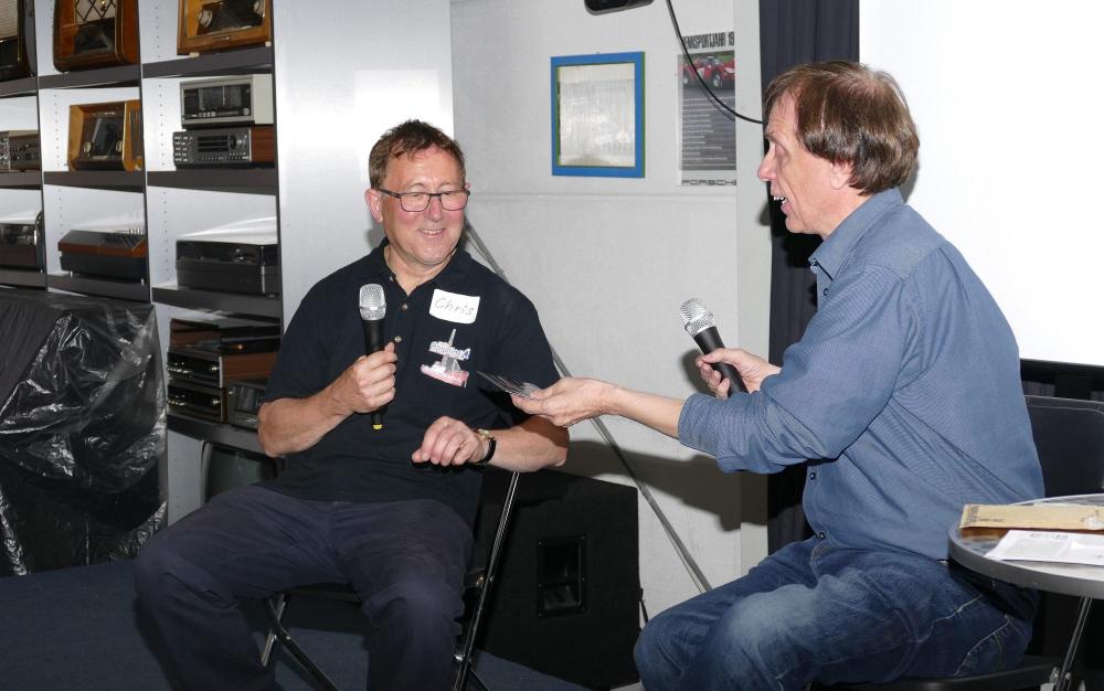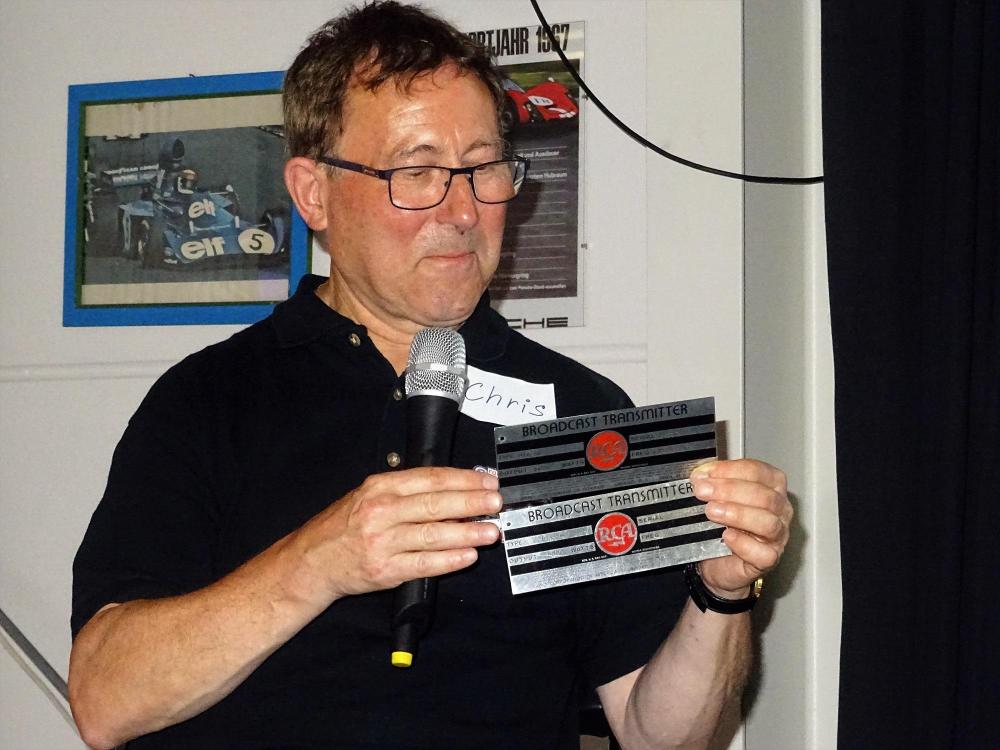 Geplaatst 6 maart 20223 jr. vor 23 Stunden schrieb Helmut: Ne dit klopt niet, toen ik in 1985 aan boord was heeft een vriend van me de typenbordjes van de twee 5 kW zenders(2 mal 5G) gestolen, deze waren toen niet in gebruik. Deze heb ik drie jaar geleden, op de Duitse Radiodag in Hilden aan een medewerker van Caroline op de bühne overhandigd. 2 foto's van Chris Cooper en Helmut in het jaar 2019. © Frank Leonhardt en Jan van Heeren 6 maart 20223 jr. bewerkt door MvdVen