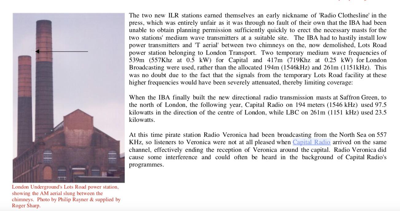 Geplaatst 22 maart 20223 jr. 22 uur geleden zei Juul: Dank Ben. Â Leuk. Â Hier nog wat info ============= The station unwittingly played a part in the birth of commercial radio in the UK. When the first two stations opened in October 1973 (LBC and Capital Radio), the site for their medium wave transmitters was not complete. As a result, temporary transmitters (417Â metres (1,370Â ft) high for LBC and 539Â m (1,770Â ft) high for Capital Radio) were strung up between the two chimneys until the permanent site at Saffron Green was ready in 1974. ========== Â Â Hier heeft iemand het niet begrepen. Golflengte wordt verward met antenne hoogte