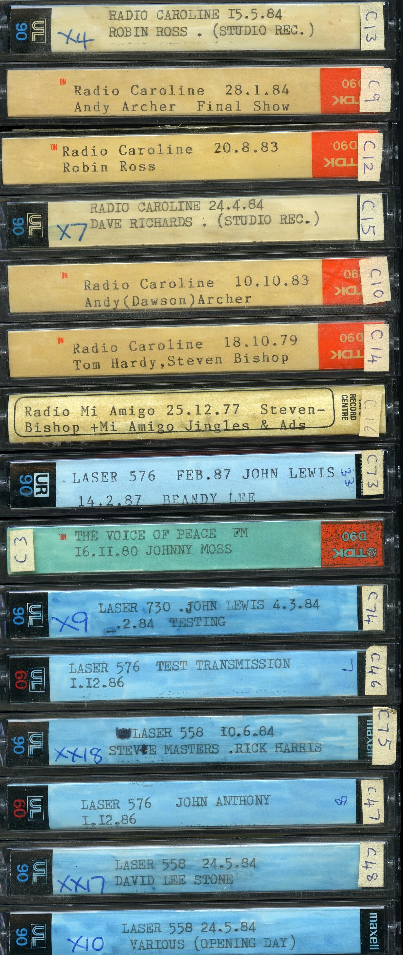 Geplaatst 7 april 20223 jr. Populair bericht Ik ben een aantal cassettes tegengekomen (afkomstig van James Hutchison), waarvan ik geen idee heb of dat allemaal bekend spul is of dat dat unieke opnamen zijn, die hij zelf heeft opgenomen. Misschien kunnen de Caroline/Laser experts hier 's naar kijken of er interessant opnamen tussen zitten?