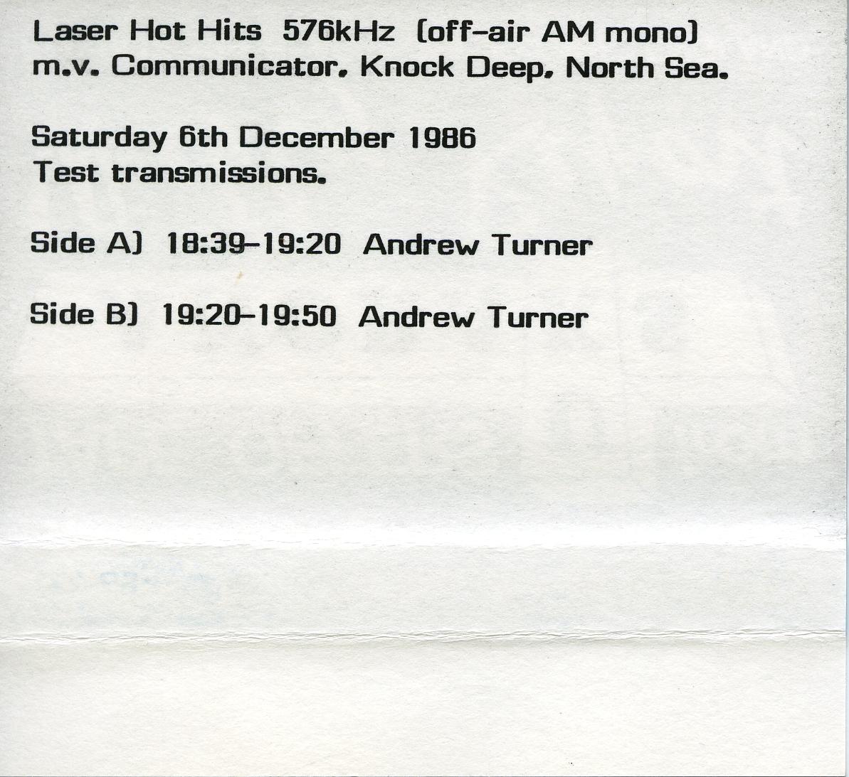 Geplaatst 5 mei 20223 jr. Populair bericht Deze opname komt van een cassette van ANORAKS UK. Laser Hot Hits 06-12-1986 18:39-19:50 Andrew Turner