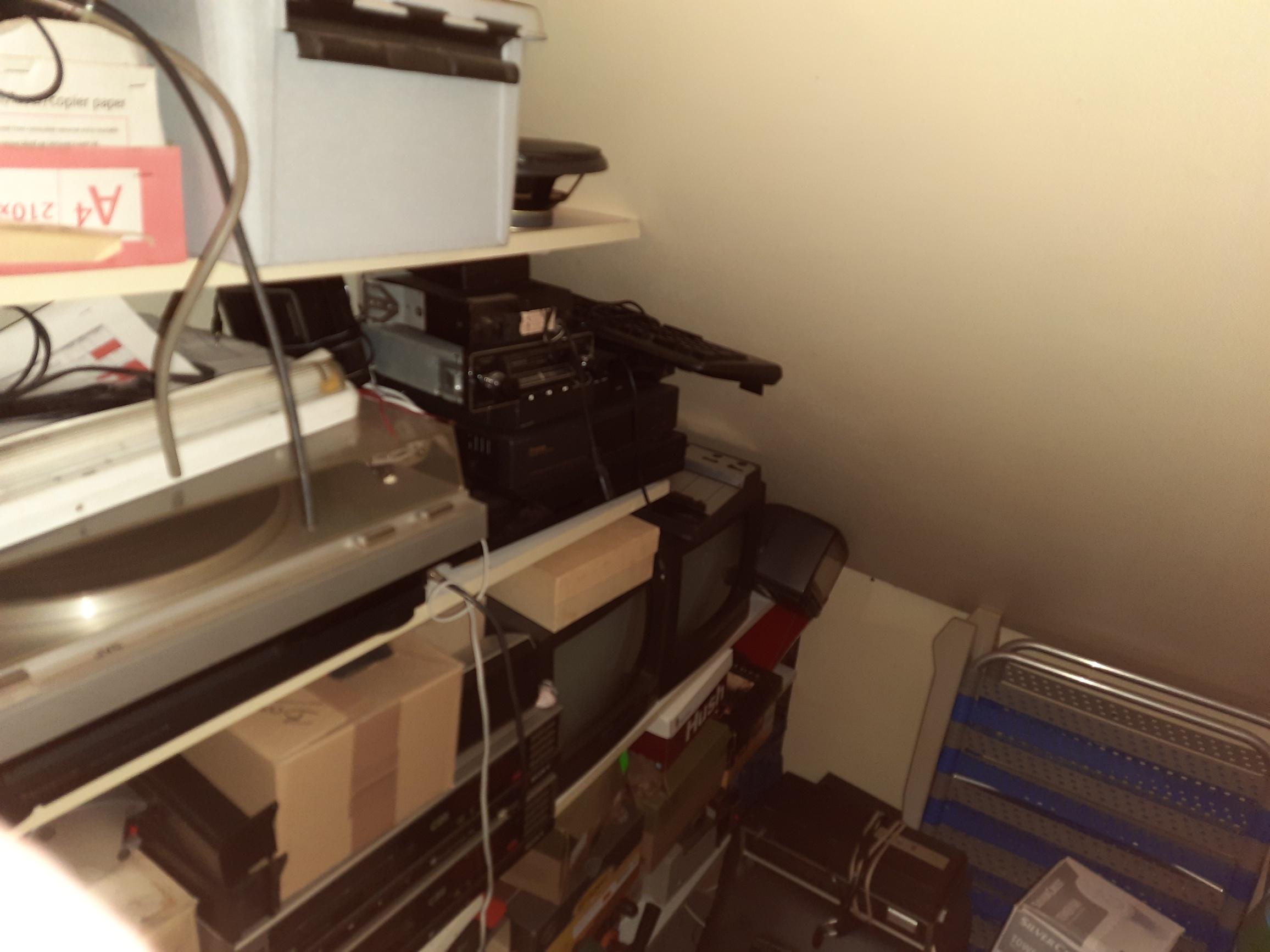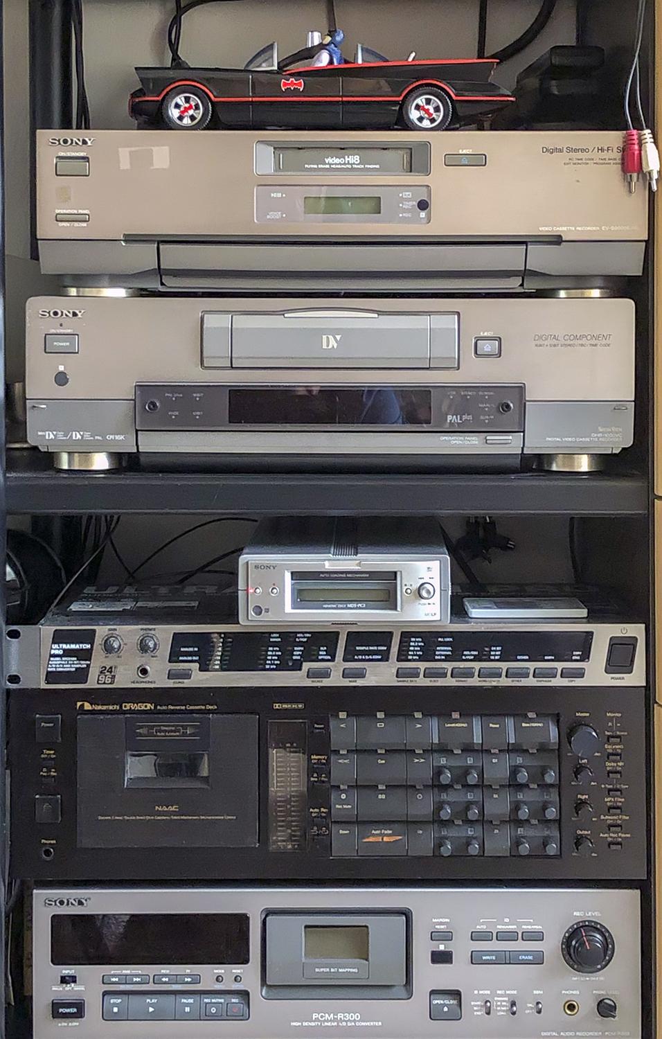 Geplaatst 29 mei 20223 jr. Rechts van m'n bureau in de woonkamer staan een 2-spoor en een 4 spoor Revox A77. Links van m'n bureau (met computer en scanner) in de huiskamer staat dit. Van beneden naar boven: Een Sony DAT recorder/speler Een Nakamichi casetterecorder/speler (geeft werkelijk prachtig geluid) Een AD/DA en samplerate converter Een MD recorder/speler Een DV recorder/speler een Hi8/V8 recorder Speler De Batman auto