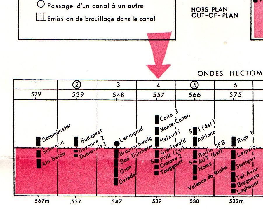 Het moet ook toen al een enorme klus geweest zijn om een redelijk vrije frequentie te vinden. Omdat de meeste piraten gewoon op land stonden, alles in het rode gedeelte. Op 557 dus 2 legale en 5 piraten. Veronica was geen piraat want voor buiten de territoriale wateren was geen afspraak en ook geen verbod (ik vertel jou niks nieuws).