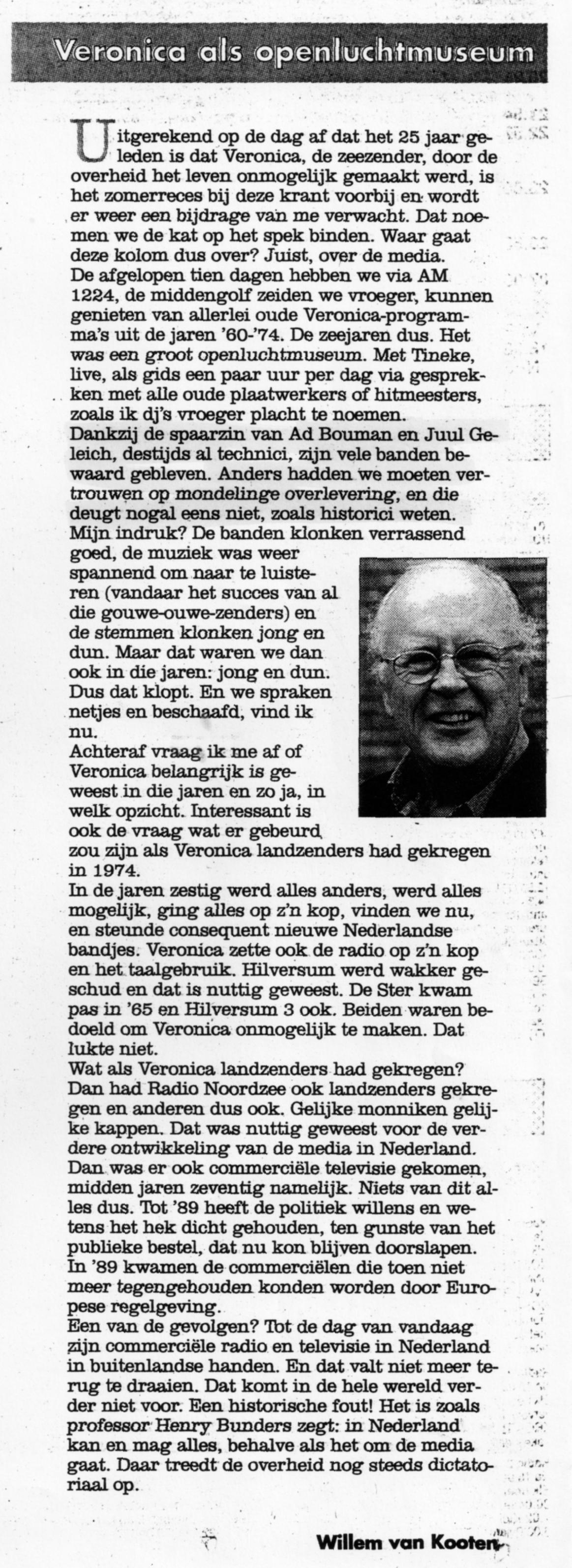 Geplaatst 6 januari6 jan Populair bericht Dank Piet, Ook hier weer een paar dingen die een beetje schuren met de geschiedenis. Voor wat betreft de Veronica periode. En zoals Ad en ik gisteren tegen elkaar zeiden;Het zal onze tijd wel duren".............................😀.. In het artikel dat Piet hierboven poste staat iets over een columm van Willen in "de Gooi" zoals wij in Hilversum zeiden. Hier is er één van 31aug. 1999 bron: Gooi & Eemlander. 6 januari6 jan bewerkt door Juul