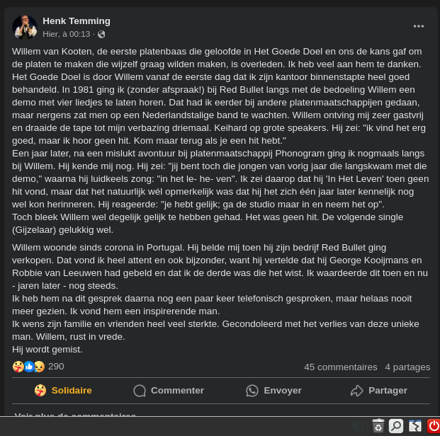 Geplaatst 5 januari5 jan Populair bericht 37 minuten geleden zei Samba-boy: Op Facebook zag ik ook een bepaald verhaal met een herinnering aan van Kooten langskomen, maar kan 'm nu helaas niet meer terugvinden. Iemand die schreef over hoe hij (met of zonder band) die dag een bespreking had bij Red Bullet en de secretaresse aangaf 'laat die demo's maar even hier, we luisteren later er wel even naar'; dat weigerden ze, want ze zouden nog langs EMI en consorten gaan, en dan moesten de demo's mee. Ik had weinig tijd dus kon niet verder lezen, maar kan het verhaal helaas ook niet meer terugvinden. Iemand een idee waar ik het over heb en wie dit wellicht schreef? Henk Temming had in ieder geval meer geluk: 5 januari5 jan bewerkt door Sylvester